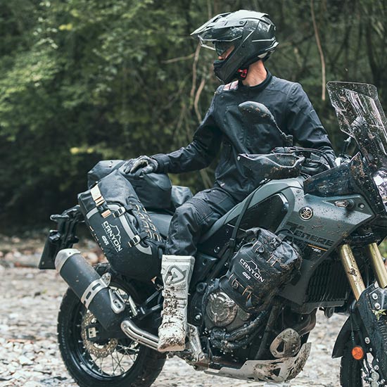 Made from high-strength materials, it's built to handle rough tracks and wild weather. The set includes two 16 litre side bags and a 12 litre top bag, all fully waterproof with roll tops and welded seams. M.O.L.L.E. panels let you attach extras like tool rolls or the mini GRT730 bag, and reflective detailing improves visibility in low light.